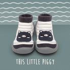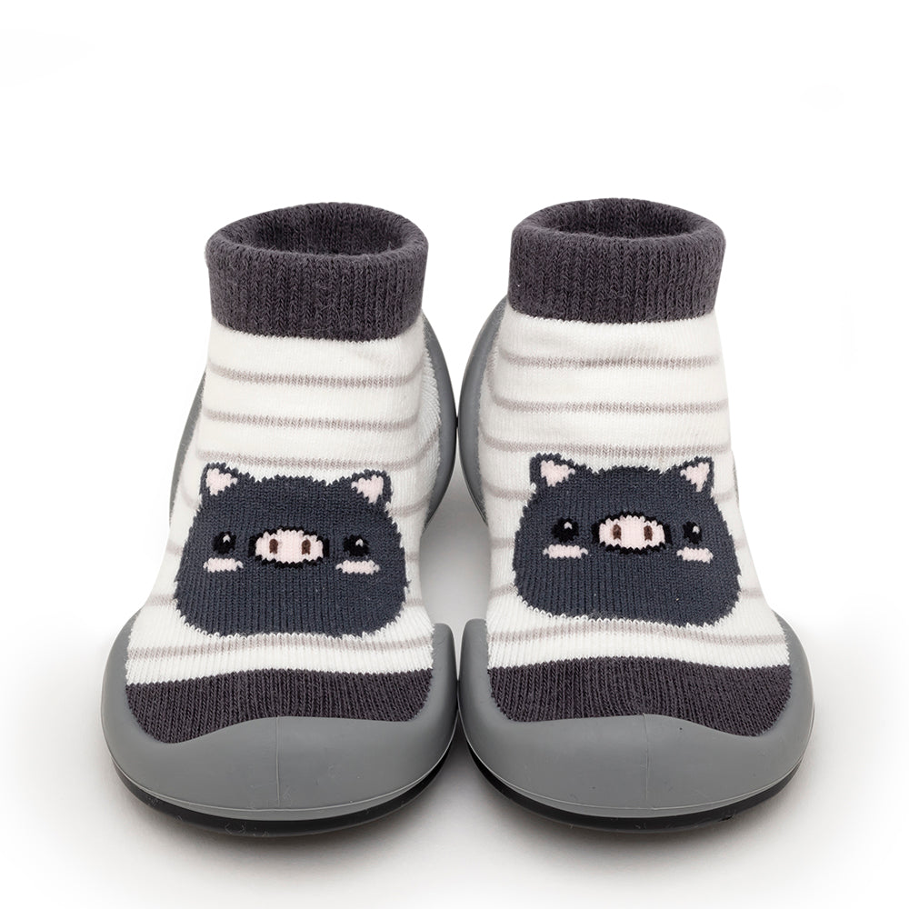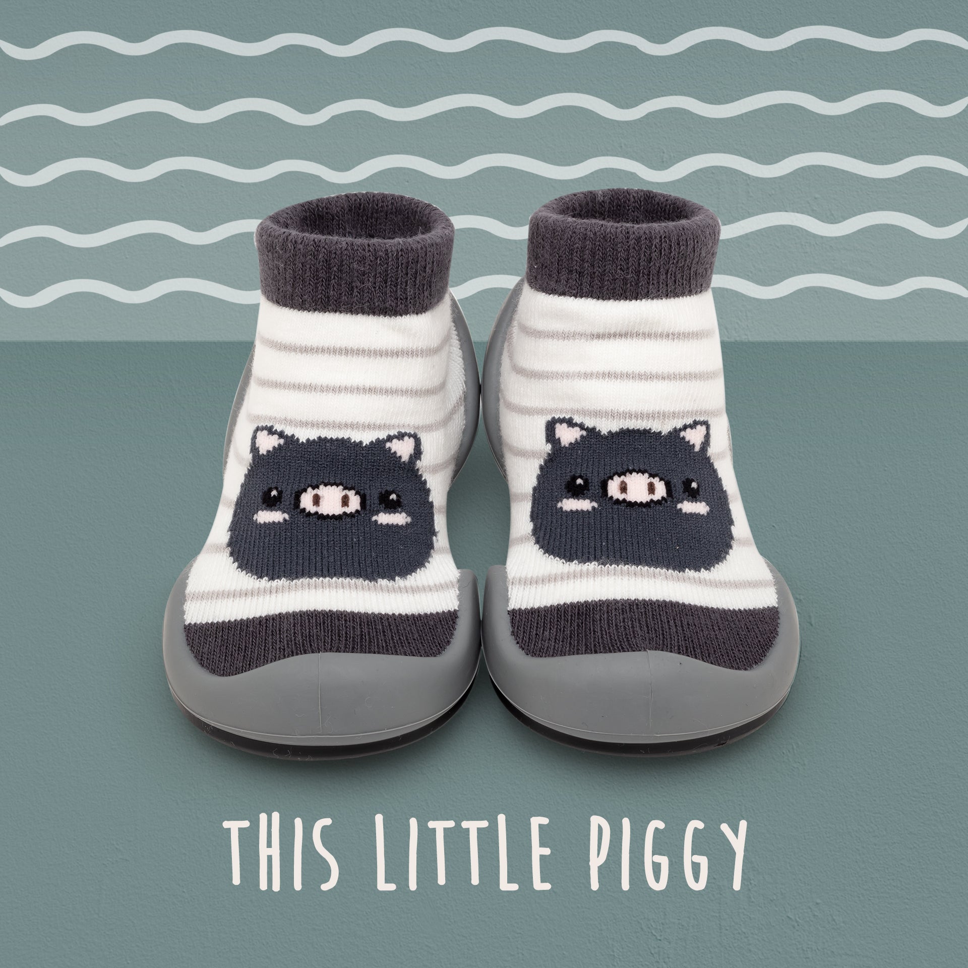 Farm animal favorite! Couldn’t get any more adorable than little gray piggies on your little ones toes! Cute, and fun design with a light gray stripe making this pair a gender neutral wear!