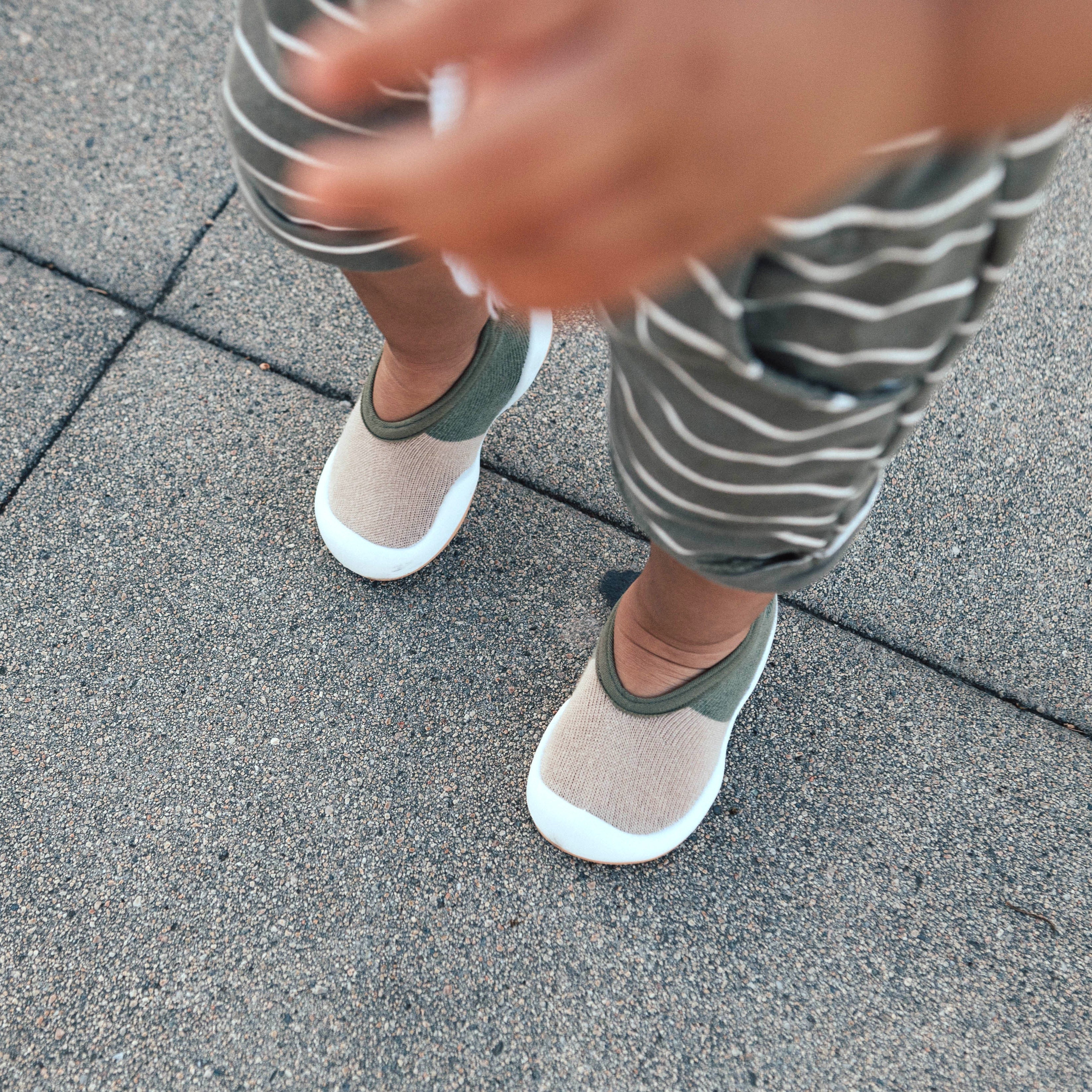 Child's legs and feet and Komuello blue Sneakers sock shoes.